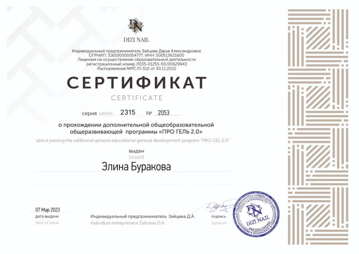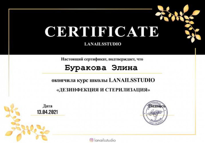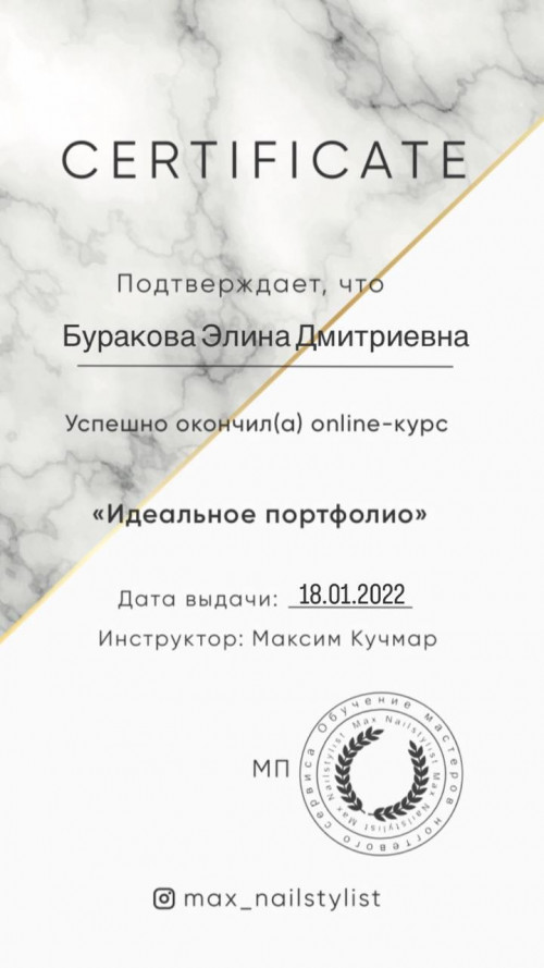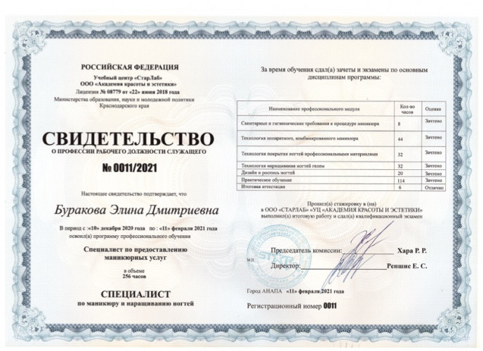 Дипломированный специалист по маникюру и педикюру.